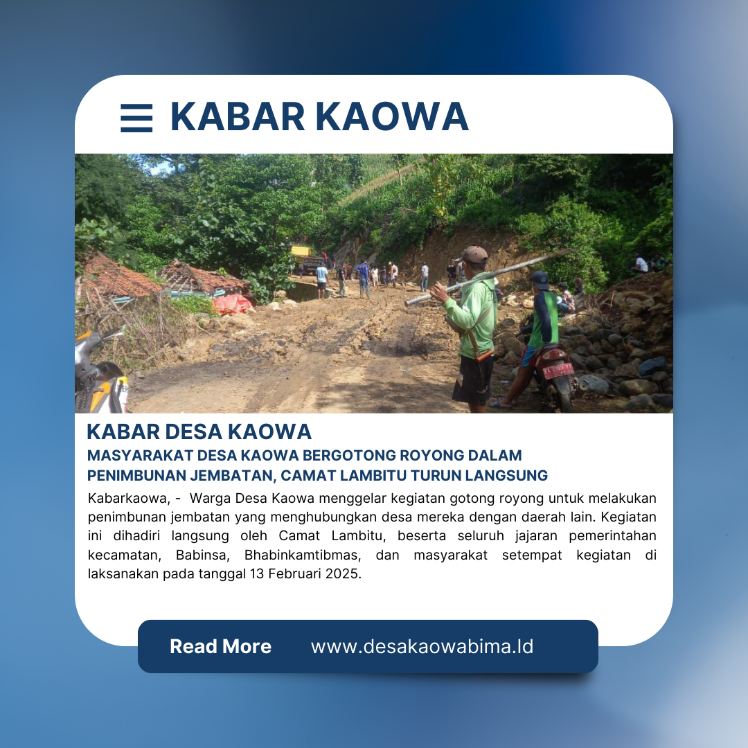 Kabarkaowa– Warga Desa Kaowa menggelar kegiatan gotong royong untuk melakukan penimbunan jembatan yang menghubungkan desa mereka dengan daerah lain. Kegiatan ini dihadiri langsung oleh Camat Lambitu, beserta seluruh jajaran pemerintahan kecamatan, Babinsa, Bhabinkamtibmas, dan masyarakat setempat kegiatan di laksanakan pada tanggal 13 Februari 2025.