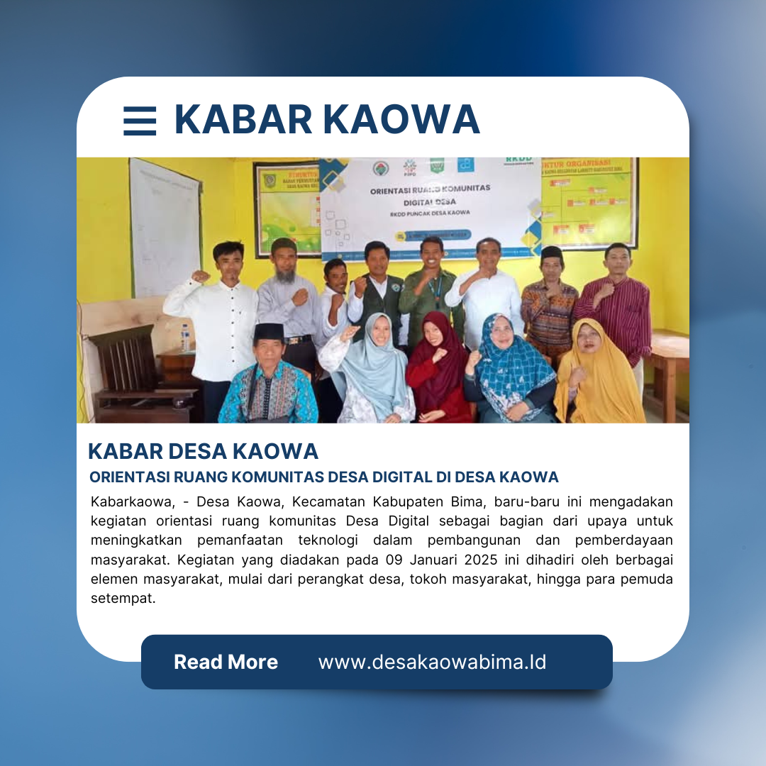 Kabarkaowa, Desa Kaowa, Kecamatan Kabupaten Bima, baru-baru ini mengadakan kegiatan orientasi ruang komunitas Desa Digital sebagai bagian dari upaya untuk meningkatkan pemanfaatan teknologi dalam pembangunan dan pemberdayaan masyarakat. Kegiatan yang diadakan pada 09 Januari 2025 ini dihadiri oleh berbagai elemen masyarakat, mulai dari perangkat desa, tokoh masyarakat, hingga para pemuda setempat.