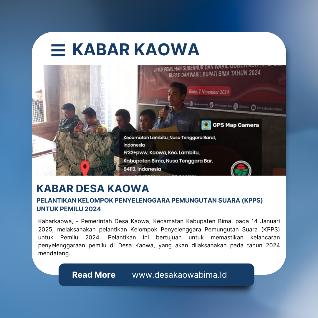 Kabarkaowa – Pemerintah Desa Kaowa, Kecamatan Kabupaten Bima, pada 07 November 2024, melaksanakan pelantikan Kelompok Penyelenggara Pemungutan Suara (KPPS) untuk Pemilu 2024. Pelantikan ini bertujuan untuk memastikan kelancaran penyelenggaraan pemilu di Desa Kaowa, yang akan dilaksanakan pada 17 November 2024 mendatang.