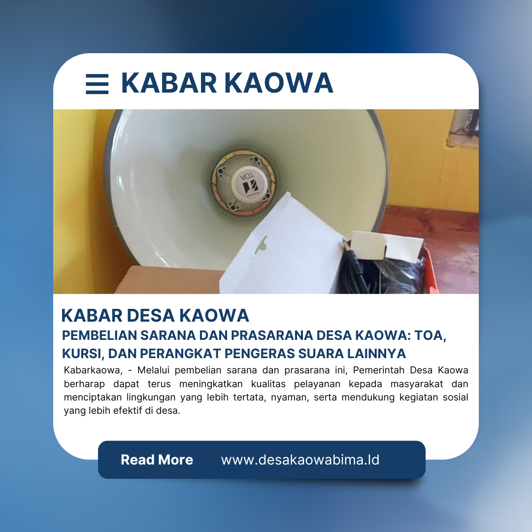 Kabarkaowa, – Pemerintah Desa Kaowa, Kecamatan Kabupaten Bima, baru-baru ini melakukan pembelian sarana dan prasarana yang meliputi peralatan penting seperti TOA (Public Address System), kursi, dan perangkat pengeras suara lainnya. Pembelian ini bertujuan untuk mendukung kelancaran kegiatan masyarakat serta meningkatkan fasilitas yang ada di Desa Kaowa.