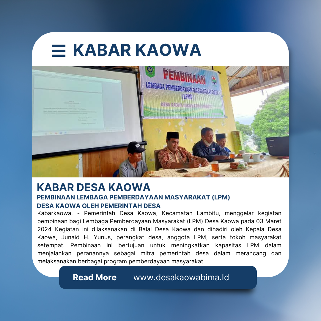 Kabarkaowa – Pemerintah Desa Kaowa, Kecamatan Lambitu, menggelar kegiatan pembinaan bagi Lembaga Pemberdayaan Masyarakat (LPM) Desa Kaowa pada 03 Maret 2024 Kegiatan ini dilaksanakan di Balai Desa Kaowa dan dihadiri oleh Kepala Desa Kaowa, Junaid H. Yunus, perangkat desa, anggota LPM, serta tokoh masyarakat setempat. Pembinaan ini bertujuan untuk meningkatkan kapasitas LPM dalam menjalankan peranannya sebagai mitra pemerintah desa dalam merancang dan melaksanakan berbagai program pemberdayaan masyarakat.